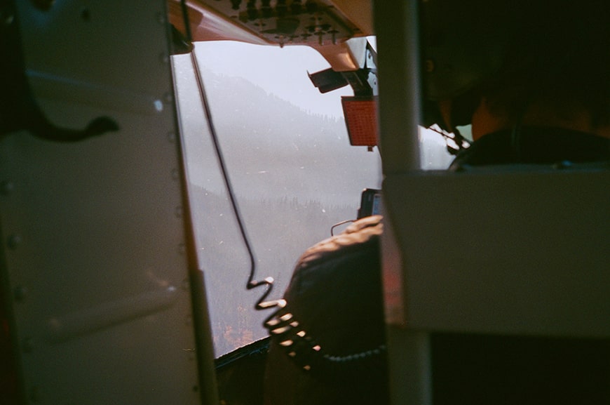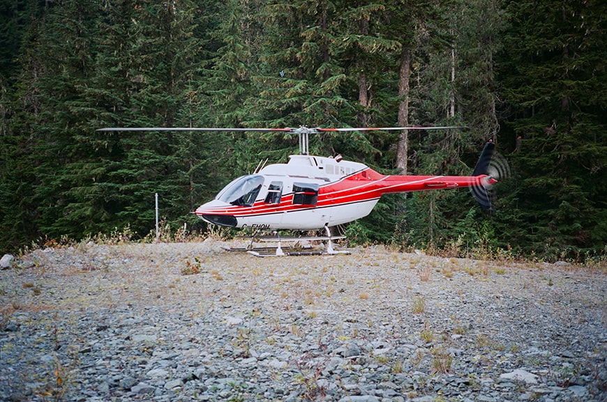 Shortly after arriving and unloading, the distant buzz of Black Tusk Helicopter's Bell 206B-3 could be heard approaching. It crested a ridge and then could be felt as much as it was heard through the low hanging smoke from burning wildfires. Our pilot touched down, and proceeded to brief us on the helicopter and safety protocols when entering and exiting.