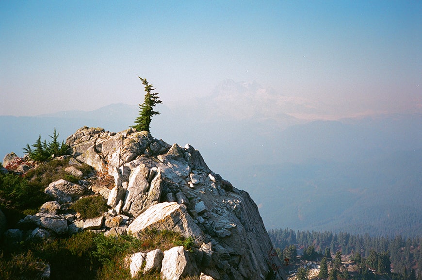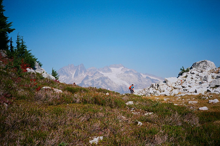 The extra effort taking the long route home was validated as we reached the first ridge, with unobstructed views of Mamquam Mountain (2588m), Delusion Peak (2517m) and the surrounding mountains.