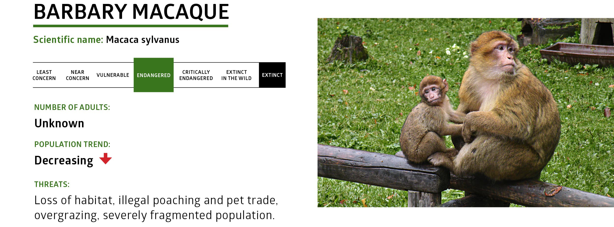 The population of Barbary Macaques in the wild in the Atlas Mountains is reaching a critical level and several organisations are making efforts to protect and support the species. It will take continued conservation measures and increased enforcement of wildlife trafficking laws to help save the Barbary Macaque.