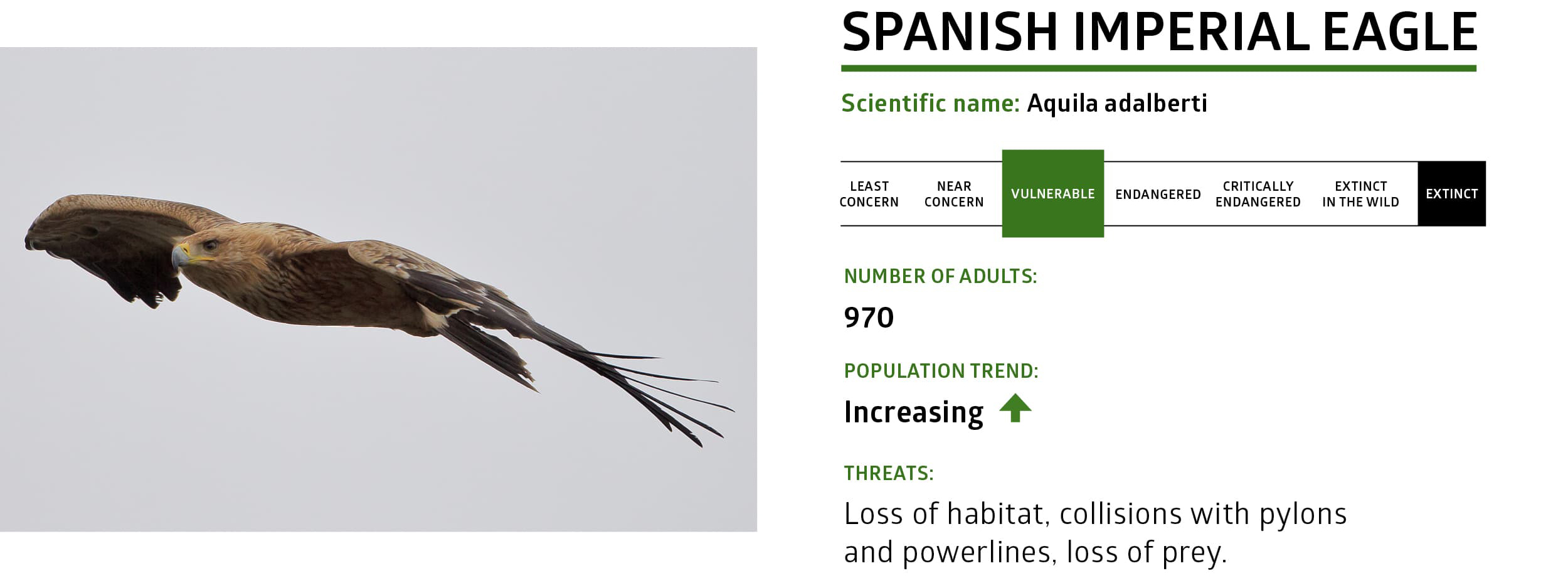 The Spanish Imperial Eagle, or Iberian Imperial Eagle, is considered vulnerable by the IUCN Red List and is also a focus of the WWF. The Spanish Imperial Eagle is one of the rarest raptors in the world and in the 1970s there were only 50 breeding pairs left. Thankfully, conservation efforts have allowed the population to recover to an estimated 485 breeding pairs.